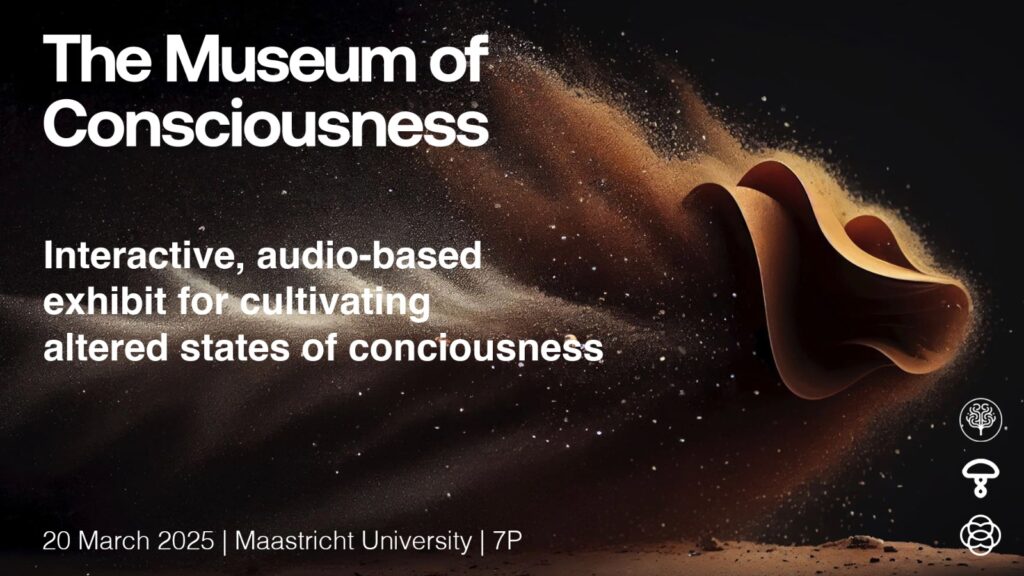 Le 20 mars, la Psychedelic Society Maastricht accueillera le Museum of Consciousness à l’université de Maastricht, aux Pays-Bas. Créé et animé par le célèbre chercheur et innovateur Carl Hayden Smith, le Musée de la Conscience est une exposition unique et immersive conçue pour induire des états de conscience expansifs par le biais d’expériences audio. Cet événement offre une occasion unique d’explorer la conscience à travers des expériences sonores immersives.
